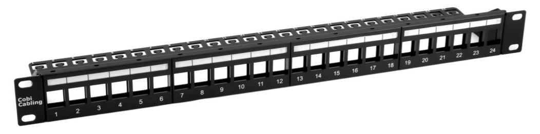 Niewyposażony PATCH PANEL CobiCabling posiada tylną prowadnice kabli a także etykiety opisowe, zabezpieczone przeźroczystymi osłonami zapewniając dobra widoczność i ochronę. W komplecie z panelem znajdują się opaski zaciskowe do mocowania kabli. Wyposażenie panelu w moduły CobiCabling to sposób na szybką i solidną instalację.